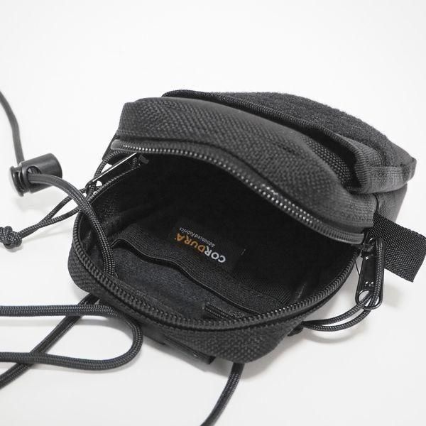 ハトメ穴に通してあるパラシュートコードを中から引き出してショルダーストラップにすると肩掛けも可能で中央の小さなテープタブを介して短く左右に飛び出させてカラビナ等(付属しません)を左右にフックするとパンツのベルトループ間にもぶら下げられます。(こうやって2点で吊る事により1点よりもかなり安定して腰にぶら下げられて高さ位置も調整出来ます。)