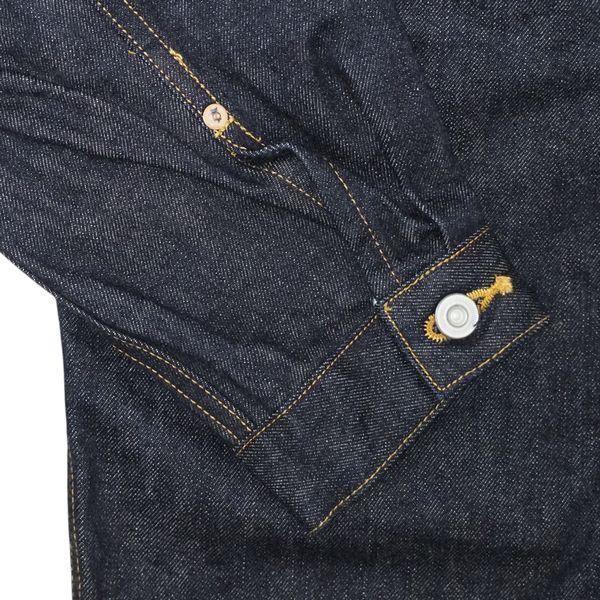 袖裏、見返し部分に赤耳セルビッチを使用。袖口と胸ポケット部分にはリベット補強が施され荒々しい武骨な雰囲気を演出。背面にはシンチバッグがついたワークウェアテイストも持った一着。
