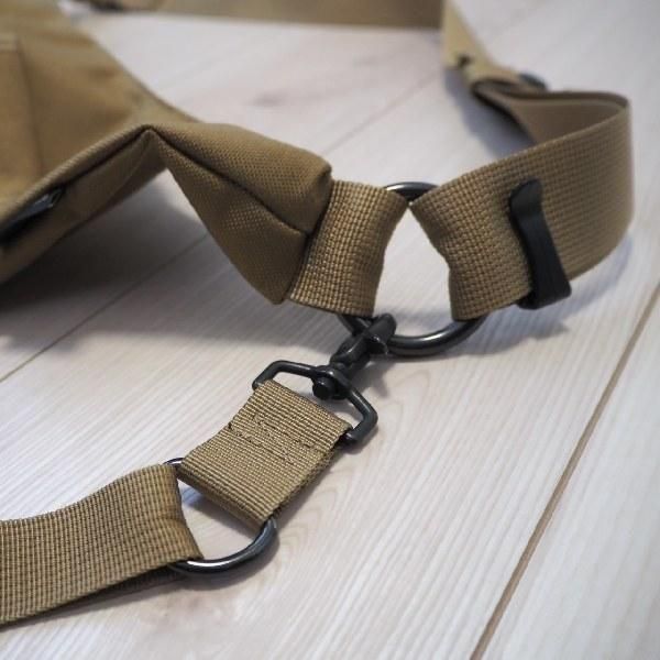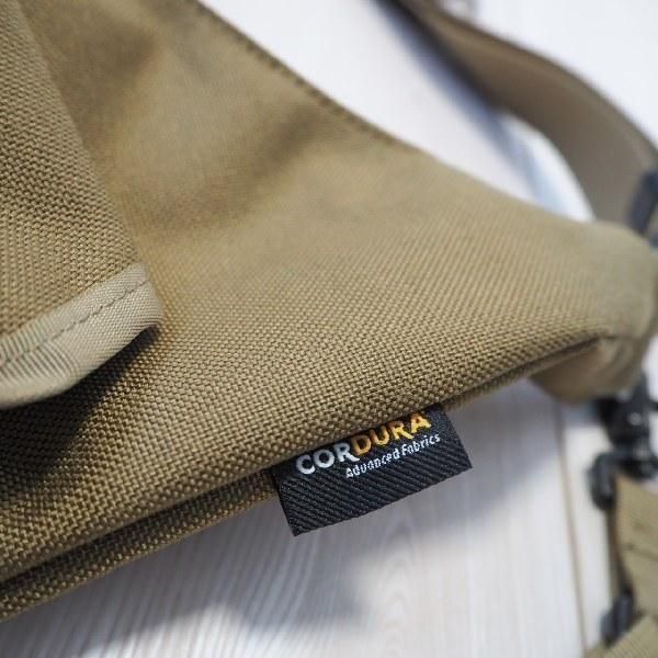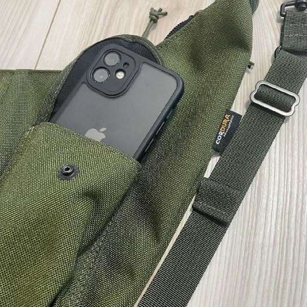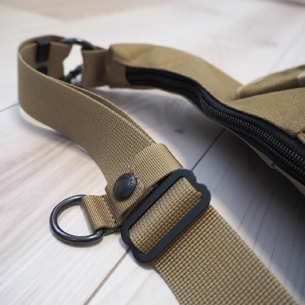 付属のサブストラップで身体に完全固定する事が出来るので、バイクや自転車に乗った際にも安心です。メインコンパートメントの他に3つのポケットがあります。見た目よりかなり容量が有り、厚手の上着(MA-1程度)が十分に収納出来ます。1泊程度の旅行やツーリングにも十分対応出来るサイズです。